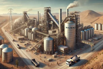 Planta de procesamiento minera en terreno árido de Durango con maquinaria y sistemas de transporte de mineral.
