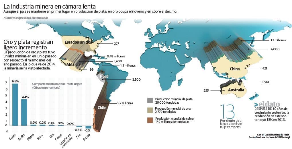 De acuerdo con un estudio de la Cámara Minera de México (CAMIMEX), la inversión total minera en 2013 se situó en seis millones 576 mil dólares y se espera que este año disminuya 400 millones de dólares al instalarse en seis millones 175 mil dólares. Incluso las exportaciones descendieron 19% y México bajó al quinto lugar como generador de divisas.