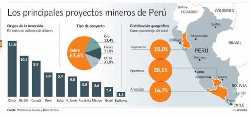 La publicación señala que estas regiones son las preferidas por los inversionistas mineros, y sus proyectos emblemáticos son: Las Bambas en Apurímac, Minas Conga en Cajamarca y la Ampliación de Cerro Verde en Arequipa.