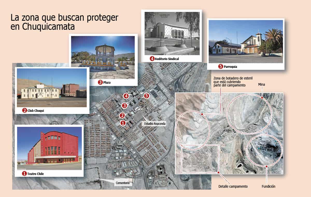 En ese proceso, la empresa tomó conocimiento de la propuesta que en diciembre hizo la comisión de Patrimonio Histórico de la entidad. Esto incluía una superficie de 36 hectáreas, que se acotaba al casco histórico y los edificios principales del campamento, más el cementerio y algunos sectores representativos de los tipos de viviendas, además del traslado y recreación de otras construcciones hacia el área a proteger, explicaron en Codelco.