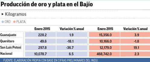 En el caso del oro, Querétaro y San Luis Potosí mostraron fortaleza productiva, ya que en el primer caso el volumen pasó de 38.3 a 49.6 kilogramos, lo que implicó un aumento de 29.5 por ciento; mientras que en la minería potosina pasó de 240.8 a 297.8 kilogramos entre enero de 2014 e igual mes del 2015, cifra que revela un incremento de 23.7 por ciento.
