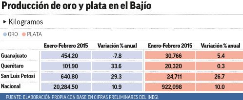 En cuanto a la producción de oro, Guanajuato obtuvo una producción de 454.2 kilogramos en el primer bimestre del 2015 lo cual fue 38.4 kilogramos menos que en igual periodo del 2014. En este metal precioso la entidad quedó en el segundo lugar en el Bajío al ser superado por San Luis Potosí, entidad que produjo un volumen de 640.8 kilogramos en el primer bimestre del 2015, en ésta entidad la producción de oro avanzó 29.3 por ciento.