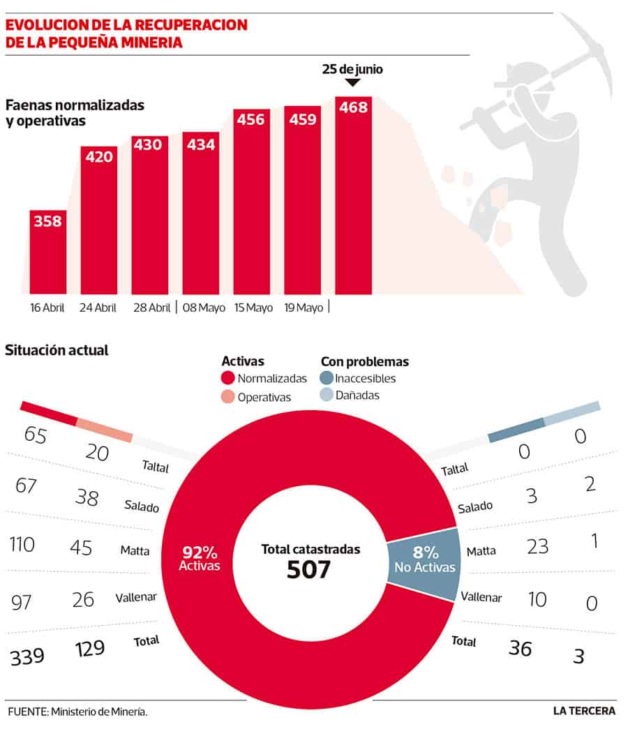 Según el catastro, de las 507 operaciones de la pequeña minería que se analizaron, 468, es decir el 92%, se encuentra operativa (sin daño, pero sin entregas de cobre a Enami) o normalizadas (operando y entregando mineral). Mientras que 36 permanecen inaccesibles (7%) y sólo tres presentan daños (1%).