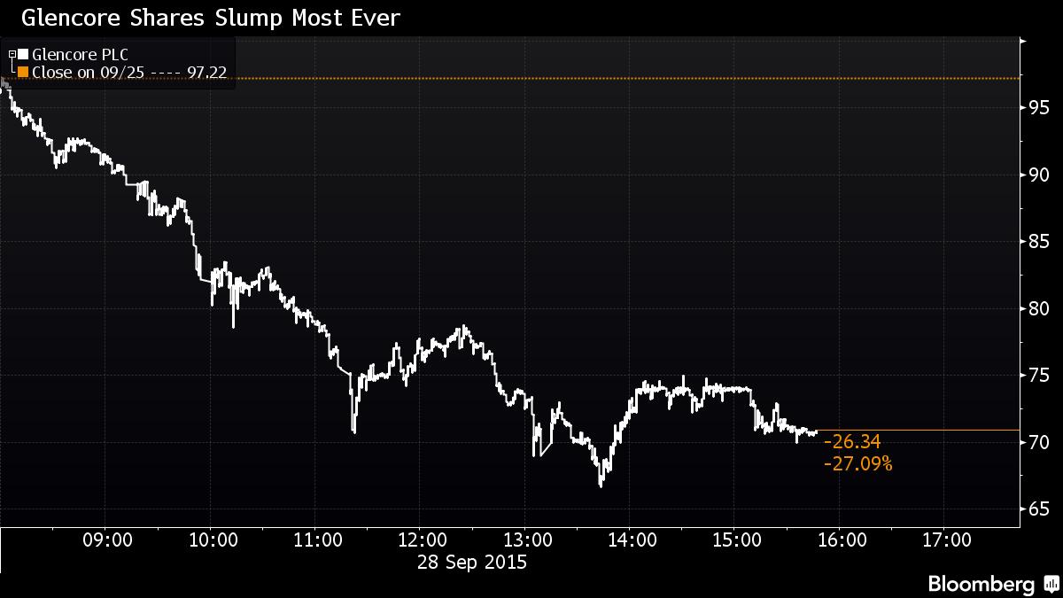 Glencore fell to a record low and was down 25 percent at 72.90 pence by 3:11 p.m. in London. The stock slumped more than 16 percent for the second time in a week and has declined 75 percent this year, the worst performance in the U.K.’s benchmark FTSE 100 Index.