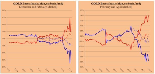 Cuando no hay suficiente oferta física de uno u otro metal precioso, el precio spot se encarece más con respecto a los futuros. Como la curva entonces en vez de ir hacia delante parece hacerlo hacia atrás, se le llama “backwardation”. Ocurre porque los tenedores de oro y plata se muestran reticentes a desprenderse de ellos. No sorprende entonces que esto se presenta cuando el precio es especialmente bajo.