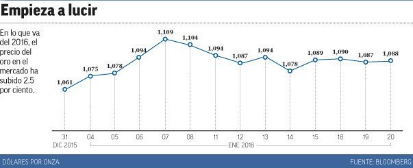 El oro terminó la sesión de este martes a un precio de mil 88 dólares por onza, un alza de 2.5 por ciento respecto a su nivel de cierre del 2015. Se trata de un tope que no alcanzaba en casi dos meses.