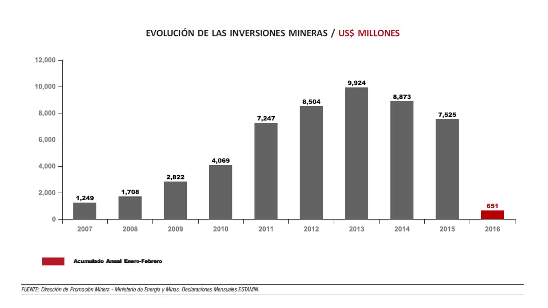 Perú.- La luz parece lejana para las inversiones mineras, ya que luego del descenso de 16% en el 2015, los resultados del primer bimestre del 2016 parecen más preocupantes, ya que muestran un descenso de 42.4%, según información oficial del Ministerio de Energía y Minas (MEM).