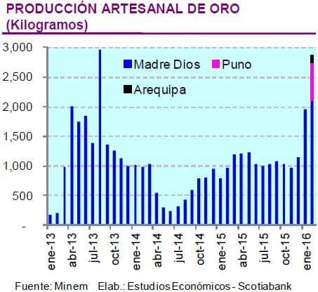 De mantenerse los niveles de producción artesanal de febrero para Madre de Dios, Puno y Arequipa, la cifra oficial de producción nacional de oro podría aumentar cerca del 10%, mientras que si el supuesto fuera que se mantiene estable respecto al año anterior la producción total caería alrededor de 4%.