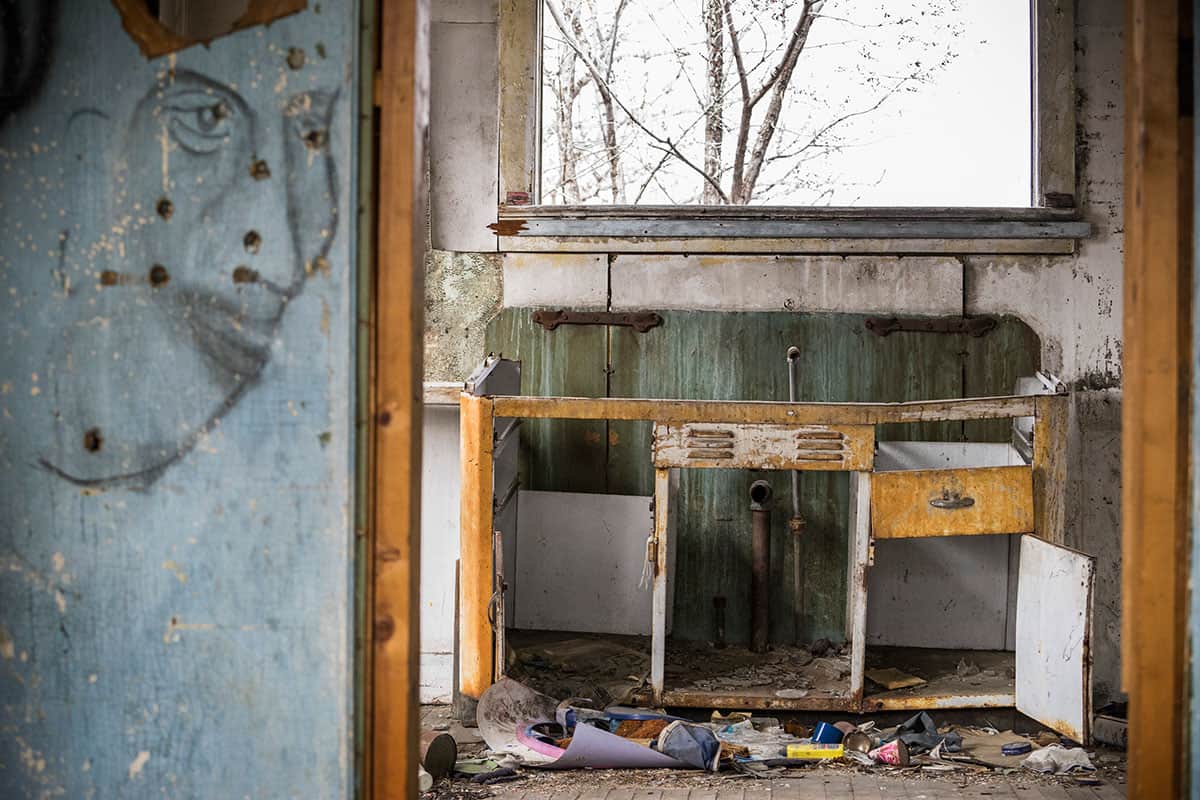 Artifacts inside the houses provide a glimpse into the former occupants’ lives. They often left their homes at short notice. In this case, plates remained atop the kitchen counter as if the family left minutes after their last meal. [Gabriela Campos/Al Jazeera]