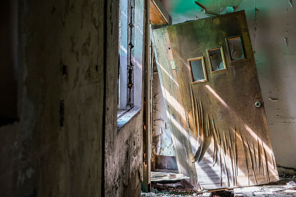 An opened door, still on its hinges, guards the entrance to an abandoned house in Fierro. [Gabriela Campos/Al Jazeera]