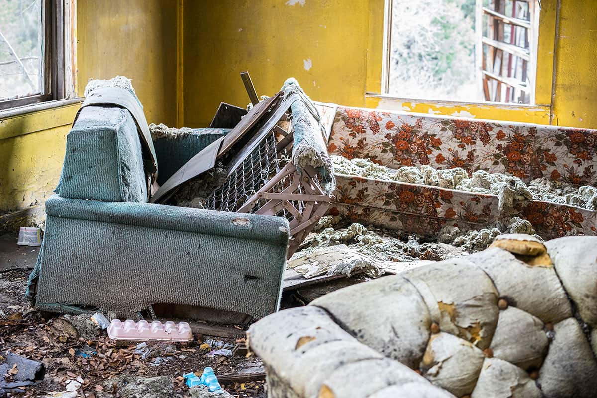 The intimate decay of a family living room in an abandoned house. The insides of the pull-out couch cover the broken floorboards. [Gabriela Campos/Al Jazeera]