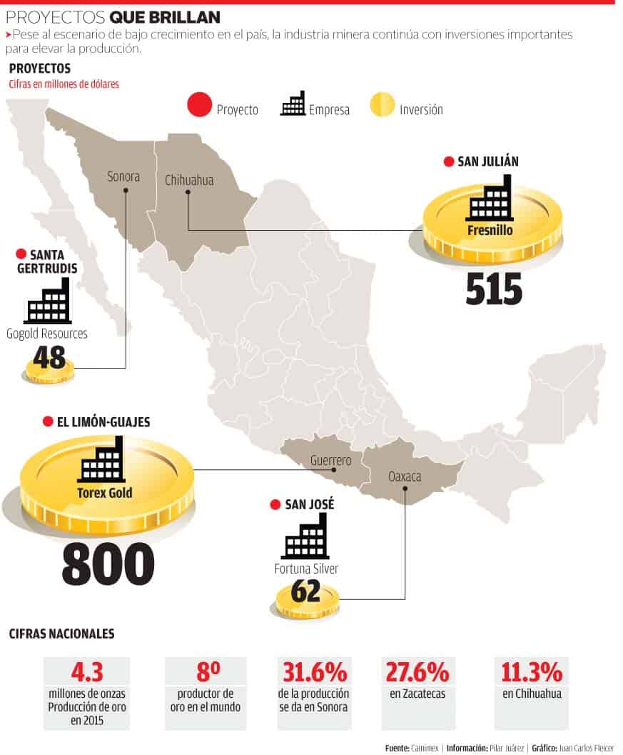 Se trata de los proyectos de San Julián, de la minera Fresnillo, en Chihuahua, con una inversión de 515 millones de dólares; el de San José, de Fortuna Silver, en Oaxaca, con 62 millones de dólares; Santa Gertrudis, de Gogold Resources, en Sonora, con 48 millones de dólares; Independencia y Guadalupe, de la empresa Coeur Mining, en Chihuahua, y El Limón-Los Guajes, de Torex Gold, en Guerrero, cuya inversión fue de 800 millones de dólares.