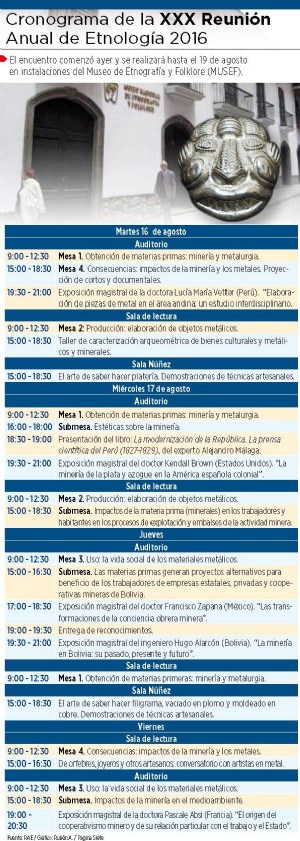 Bolivia.- Exposiciones, presentaciones de libros, charlas magistrales, muestras y conversatorios con artesanos nutren el programa de la XXX Reunión Anual de Etnología (RAE), que este año se enfocará en la cadena operatoria de los minerales y los metales. El encuentro es organizado por el Museo Nacional de Etnografía y Folklore (MUSEF).