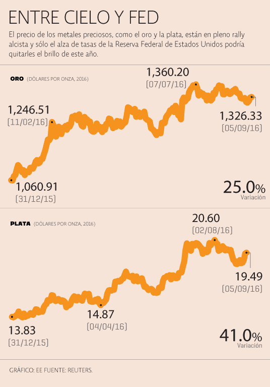 En estos momentos, el oro alcanza un precio de 1,326.33 dólares por onza, que con respecto a las cotizaciones de inicio de año representa un incremento de alrededor de 25%; mientras que la plata opera en un precio de 19.49 dólares la onza, que frente a las primeras negociaciones de este año significa un avance de 41 por ciento.