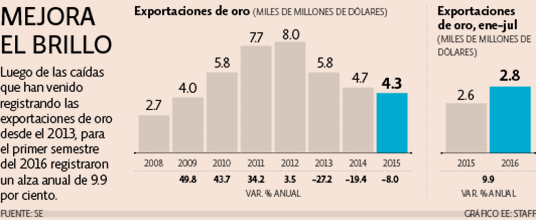 Con este ciclo a la baja, México pasó de ubicarse en la posición 11 entre los mayores exportadores de oro del mundo en el 2012 al lugar 14 en el 2015, año en que se colocó como el octavo productor de este mineral.