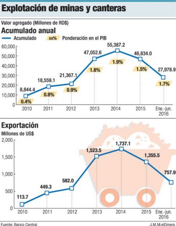La minería ha sido, históricamente, un sector de primer orden en la economía dominicana. Esta actividad económica ha aportado RD$226,023.3 millones desde 2010 hasta junio de este año y mantiene una ponderación de aproximadamente un 1.73% en el producto interno bruto (PIB), con un pico de un 1.9% en 2014 cuando aportó RD$55,387.2 millones.