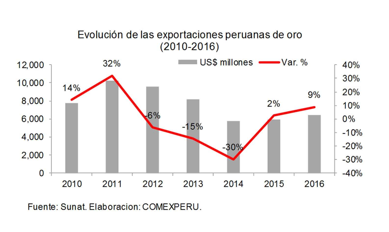 Mientras que según la Sunat, el oro fue el segundo mineral más exportado en el 2016, ya que representó el 31% del volumen total minero y un 18% del total de las exportaciones peruanas.