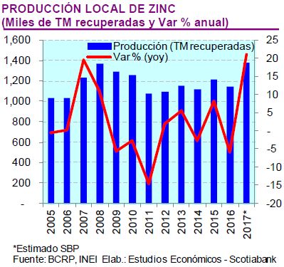 Zinc: Para el 2017 el Scotiabank estima que la producción de zinc alcance alrededor de 1.6 millones de TM finas, un incremento de 20% respecto al 2016.