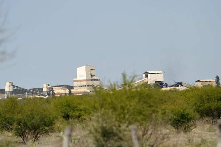 Planta de procesamiento minera en terreno árido de Durango con maquinaria y sistemas de transporte de mineral.