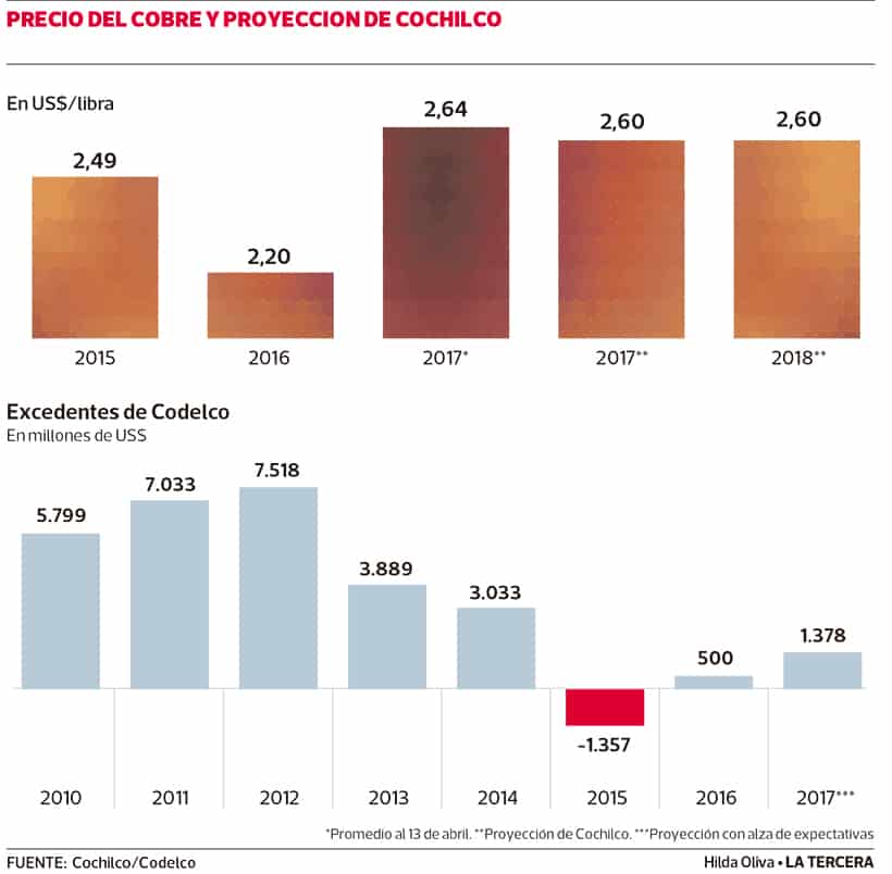 Ayer, la Comisión Chilena del Cobre (Cochilco) modificó al alza su proyección de precio promedio para 2017, elevándolo a US$ 2,60 la libra desde los US$ 2,40 la libra proyectados en enero. Esta mejora en las expectativas implicaría una mayor entrega de excedentes por parte de Codelco, en caso de cumplirse el pronóstico.