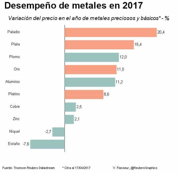 El platino avanzaba 0.1% a US$ 982.25 la onza, mientras que el paladio subía 0.5% a US$ 792.40.