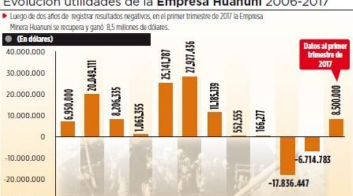 Bolivia.- Luego de dos años de déficit, la Empresa Minera Huanuni reportó una utilidad de 8,5 millones de dólares durante el primer cuatrimestre de este 2017. Los trabajadores piden beneficiarse del incremento salarial de este año.