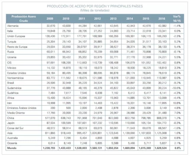 La producción de acero crudo volvió a crecer en 2016, aunque se contrajo en varios de los principales países productores como Japón, Estados Unidos, Rusia, Corea del Sur y Alemania.