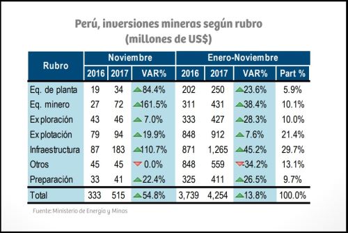 El ministerio de Energía y Minas (MEM) señaló hoy que la inversión minera en el país se acelera y solo en noviembre de 2017 alcanzó los 515 millones de dólares, monto superior en 54.8% respecto al similar mes del año anterior.