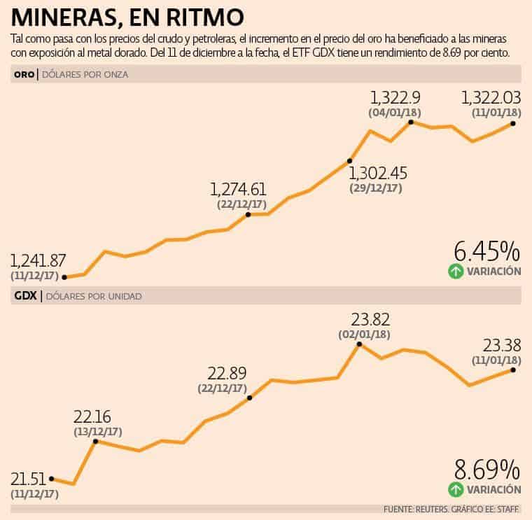El precio del metal dorado ha tenido un ascenso de 6.45% desde su punto más bajo en diciembre, un día antes de que la Reserva Federal aumentara su tasa de interés, hasta la sesión que se ubicó en 1,322.03 dólares. Con ello, las acciones de mineras en Bolsa se han visto beneficiadas.