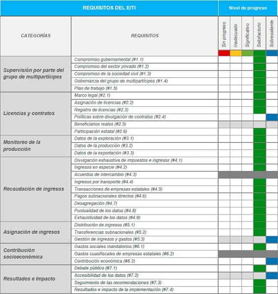 La escala valorativa de EITI cuenta con cinco categorías para acreditar el avance de sus países: sobresaliente, satisfactorio, significativo, inadecuado y sin progreso. Colombia se ubicó en el segundo escalafón en nivel de importancia, mientras que la divulgación de contratos, gestión de ingresos y gastos, contribución económica nacional y acceso a la información minero energética consiguió la máxima calificación: ‘sobresaliente’.