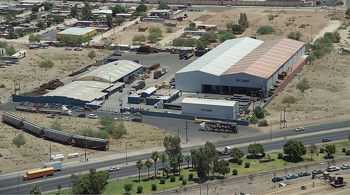 Planta de procesamiento minera en terreno árido de Durango con maquinaria y sistemas de transporte de mineral.