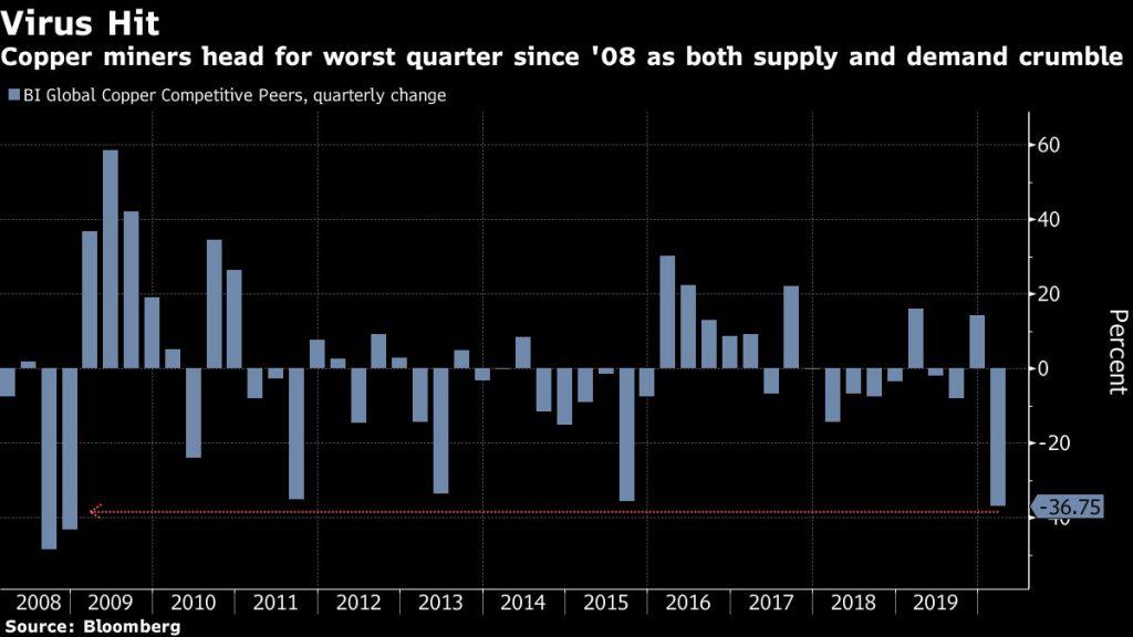 Las mineras del cobre están listos para su peor trimestre desde 2008 después de que la pandemia de coronavirus avivó los temores de la demanda de metales industriales y obligó a las empresas a frenar las operaciones mineras.