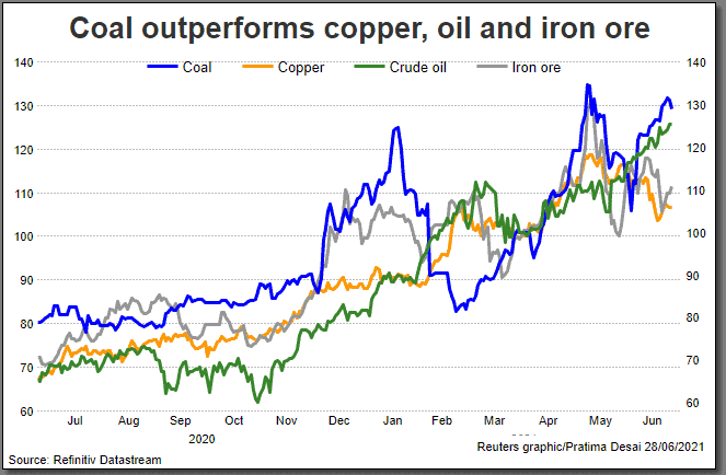 En los últimos 12 meses, el carbón ha superado a otros productos básicos, incluidos el petróleo, el cobre y el mineral de hierro. Los futuros del carbón térmico en la Bolsa de Productos Básicos de Zhengzhou alcanzaron un máximo histórico de 944,20 yuanes la tonelada el 12 de mayo, habiendo subido un 159% desde un mínimo de dos años a mediados de abril de 2020.