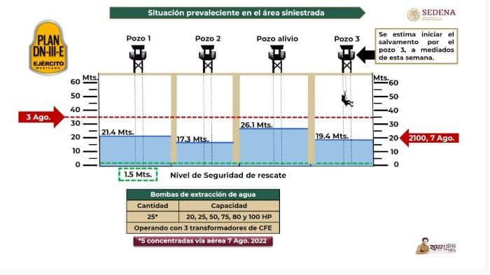 También mostró los avances de la creación de barrenos que sirven como barreras de contención para poder extraer con mayor facilidad del agua y evitar que llene más agua a los pozos.