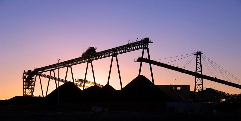 Planta de procesamiento minera en terreno árido de Durango con maquinaria y sistemas de transporte de mineral.