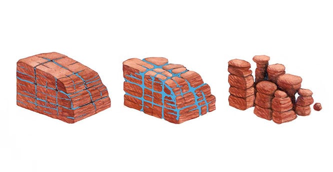 El agua puede entrar en las grietas de una roca y, si se congela, el hielo se expandirá y separará las grietas. Cuando el hielo se derrite, puede entrar más agua en la grieta más grande; si vuelve a congelarse, se expande y puede agrandar la grieta.