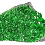 La Uvarovita es el más raro de lo familiar Granates , y rara vez se utiliza como una joya. El término Granate describe el nombre de un grupo para varios minerales estrechamente relacionados que forman piedras preciosas importantes, y Uvarovita es un mineral miembro individual del grupo Granate. Solo ocurre en cristales muy pequeños, y los cristales rara vez son lo suficientemente grandes como para ser facetados. El color de Uvarovita es un verde cromo profundo, y Uvarovita es un granate único que solo viene en un color.