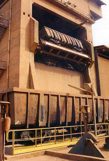 El mineral de extracción se apila en largas pilas paralelas a las vías de la mina, y el material de los distintos tajos se vuelca en capas para obtener una mezcla homogénea. Las pilas se recuperan con máquinas Caterpillar 992 que se descargan directamente en vagones de ferrocarril.