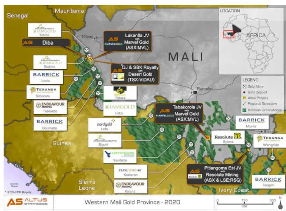 El proyecto aurífero Diba está situado en la licencia Korali Sud, en la región maliense de Kayes. Altus Strategies (Altus), una empresa británica de regalías mineras, es la propietaria del proyecto.