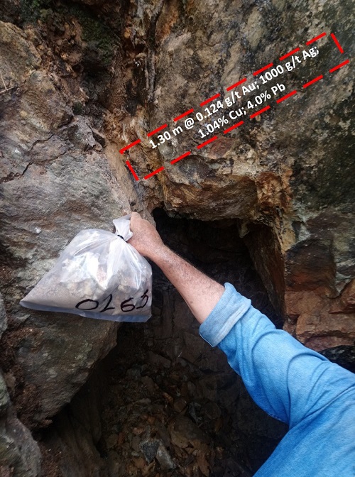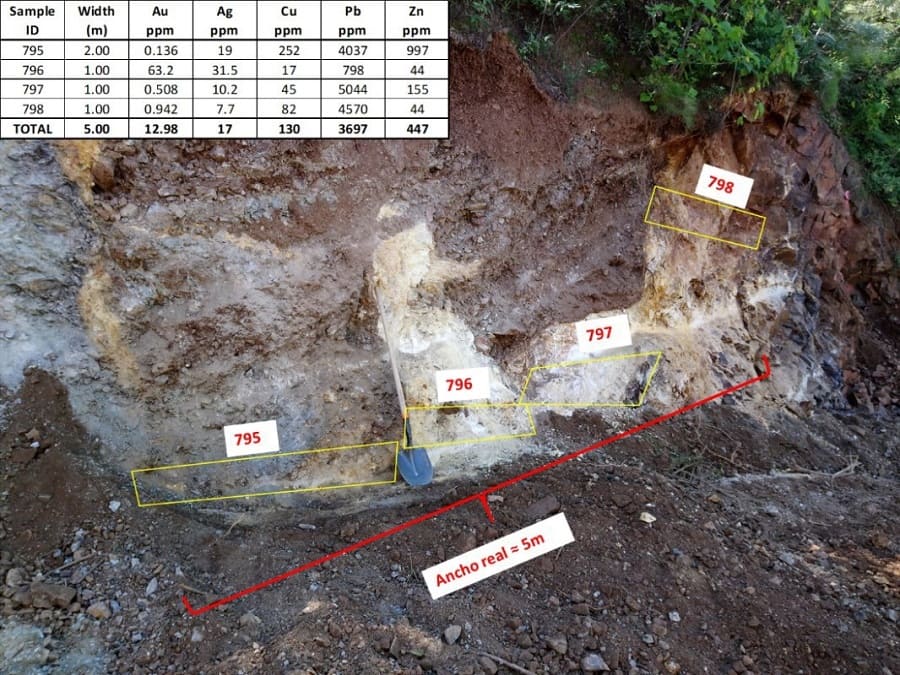 - Sistema de brechas de cuarzo/turmalina estructuralmente controlado que consiste en una mineralización de oro, plata y metales base de alta ley, dentro de un batolito de granodiorita correlacionado con las diferentes temperaturas de un sistema hidrotermal. La cartografía de superficie y el muestreo intensivo identificaron las zonas conocidas como Salto Colorado, Noche Buena, La Cueva y La Olvidada.
