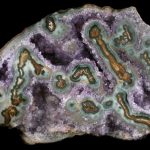 Muchas ágatas son huecas, ya que la deposición no ha avanzado lo suficiente como para llenar la cavidad, y en tales casos, el último depósito generalmente consiste en cuarzo drusy, a veces amatistina, que tiene los ápices de los cristales dirigidos hacia el espacio libre para formar un cristal. – Cavidad o geoda forrada.