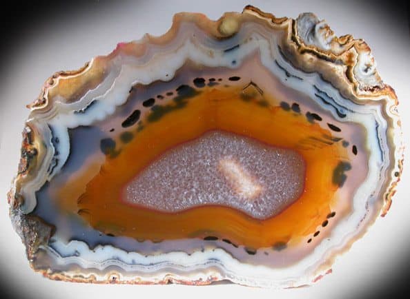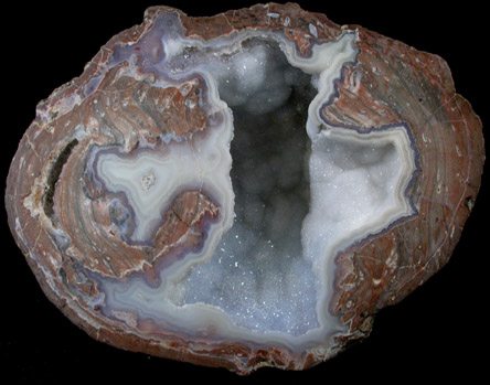 Muchas ágatas son huecas, ya que la deposición no ha avanzado lo suficiente como para llenar la cavidad, y en tales casos, el último depósito generalmente consiste en cuarzo drusy, a veces amatistina, que tiene los ápices de los cristales dirigidos hacia el espacio libre para formar un cristal. – Cavidad o geoda forrada.