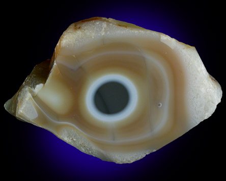 Las bandas individuales corren perpendiculares a la orientación y dirección de crecimiento de las fibras de calcedonia. Como las fibras de calcedonia crecen desde las paredes hasta el interior de una cavidad, se desarrolla un patrón concéntrico, similar a una cebolla.