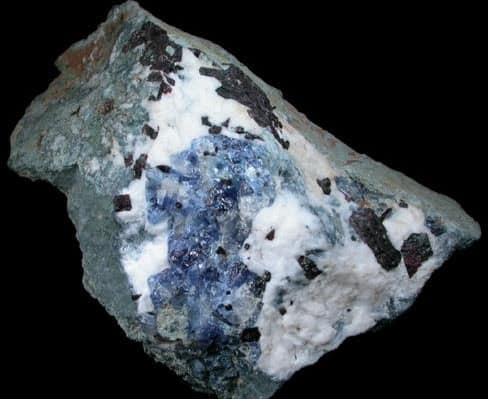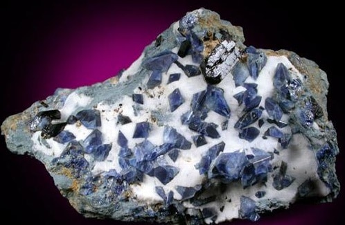 La benitoita se asocia con: natrolita , neptunita , serpentina , Albita , glaucofana , Joaquinite, Crossite