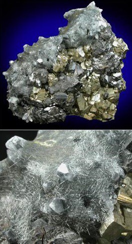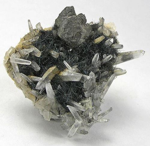 | Formas cristalinas y agregados | Muy a menudo en masas aciculares o entrelazadas de cristales largos como pelos. También fibroso, plumoso, radiante, en masas fibrosas compactas, en cristales finos delgados interconectados, y en forma masiva. Un hábito inusual es anillos cilíndricos y tubos huecos que se forman como resultado de fibras de cristal microscópicas que giran naturalmente en un patrón concéntrico durante la formación. |